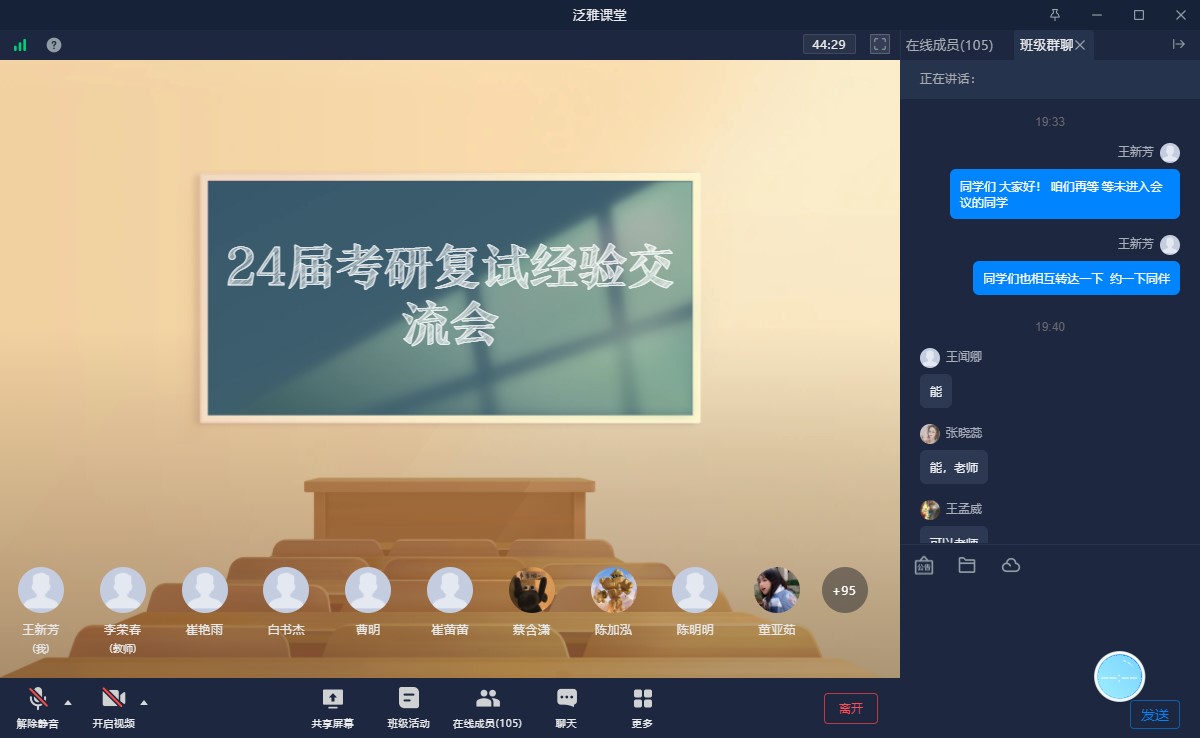 2024年2月5日,化学化工学院采用泛雅课堂形式举行考研复试经验交流会。参加会议的有王新芳副院长、李荣春老师、受邀进行经验分享的betway西汉姆联官网2019级三位同学和betway西汉姆联官网2020级本科及2022级专升本班完成考研初试的同学。会议由王新芳教授主持。