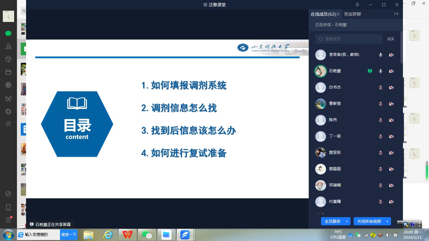 2024年3月11日,化学化工学院在学校开学后,考研同学全面进入准备复试阶段,采用泛雅课堂形式再次举行考研复试/调剂经验交流暨指导会议。参加会议的有王新芳副院长、李荣春老师、受邀进行经验分享的betway西汉姆联官网2019级三位同学和betway西汉姆联官网2020级本科及2022级专升本班完成考研初试拟上国家线的同学。