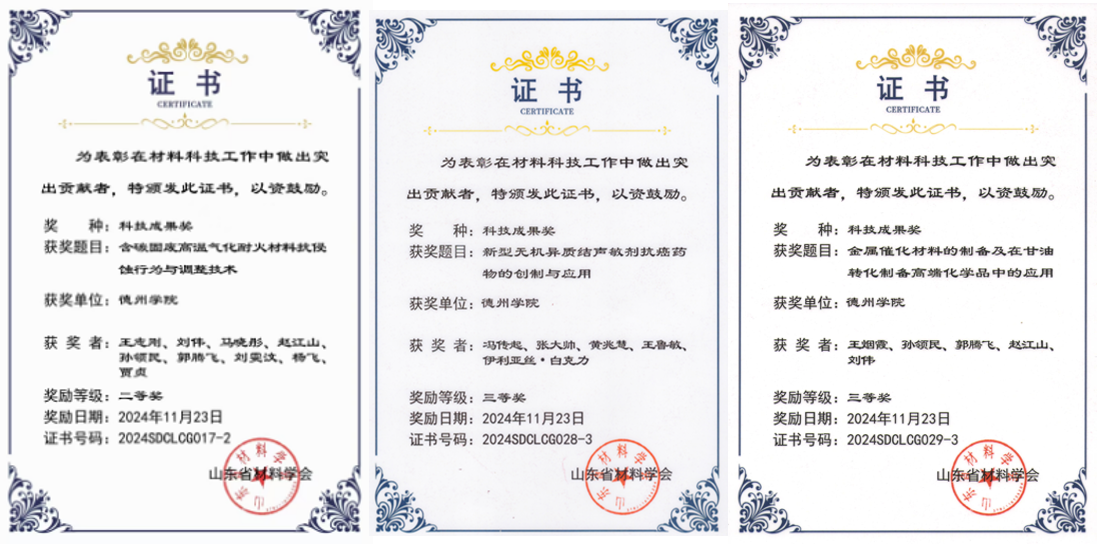 山东省材料科技成果由山东省材料学会组织,奖旨在表彰在省内材料领域科技工作中做出突出贡献集体和个人。化学化工学院3项成果的获奖实现了在该成果上的新突破,是学院近年来积极开展科研团队建设的体现,也为学院学科建设打下了基础。