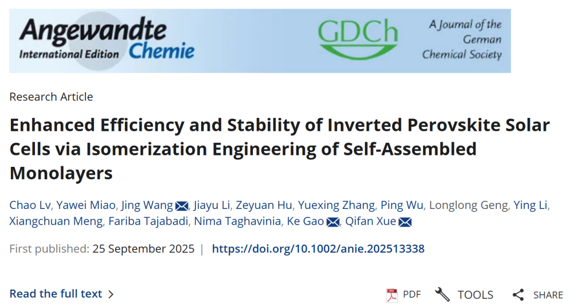近日,我校化学与化工学院吕超副教授及其合作团队在化学领域国际顶级期刊 《Angewandte Chemie International Edition》 (影响因子16.9,中科院一区top)上发表题为“Enhanced Efficiency and Stability of Inverted Perovskite Solar Cells via Isomerization Engineering of Self-Assembled Monolayers”的最新研究成果。该工作是德州学院以第一单位在Angewandte Chemie International Edition上发表的首篇论文。