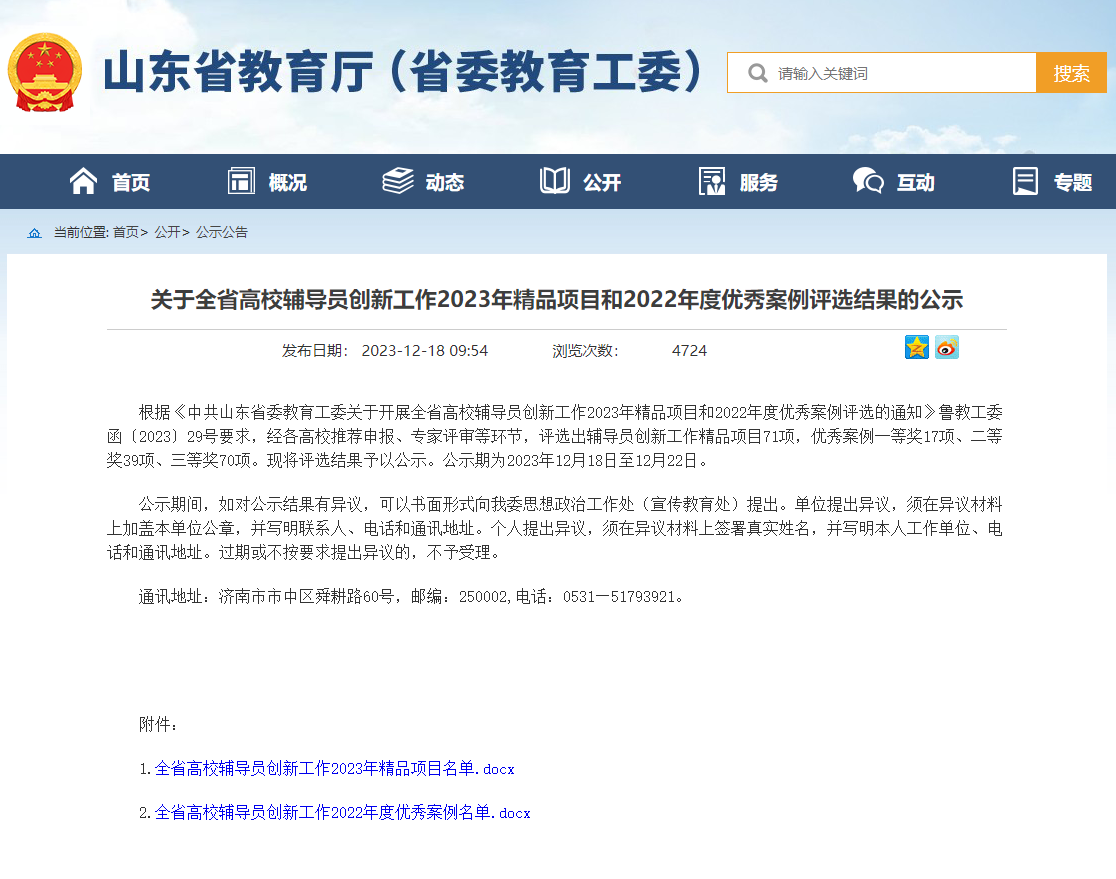 近日,中共山东省委教育工委公布了全省高校辅导员创新工作2022年度优秀案例评选结果。经各高校推荐申报、专家评审等环节,betway西汉姆联官网辅导员王培培老师的工作案例《从大学生失恋看“心灵咖啡屋”在高校辅导员谈心谈话中的创新应用》入选全省高校辅导员创新工作2022年度优秀案例,荣获三等奖。