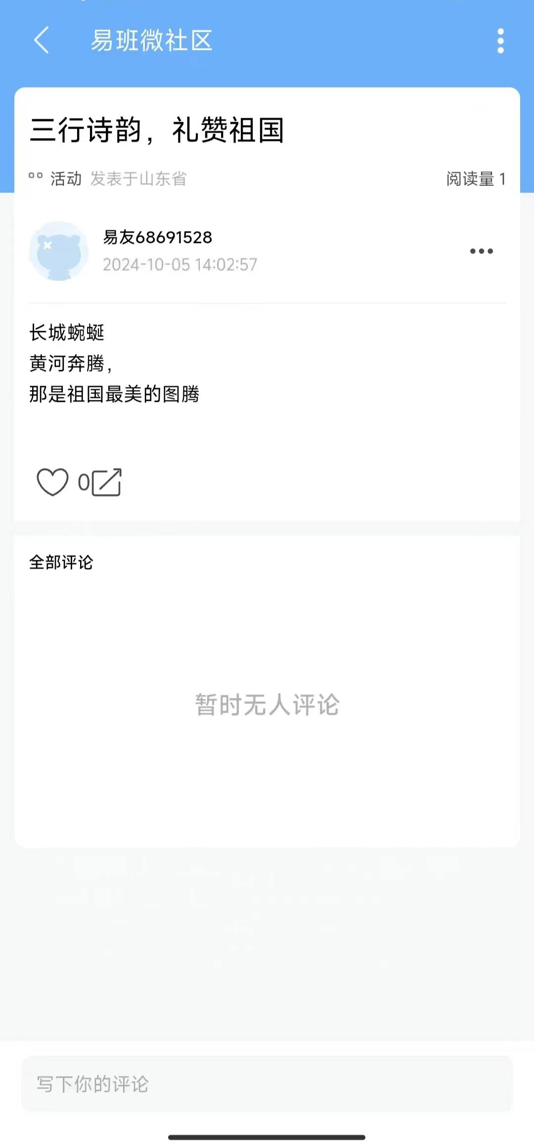 在国庆佳节来临之际,为激发同学们的爱国情怀,表达对祖国的热爱与赞美,10月1日到10月5日化学化工学院举办“三行诗韵,礼赞祖国”线上易班活动。