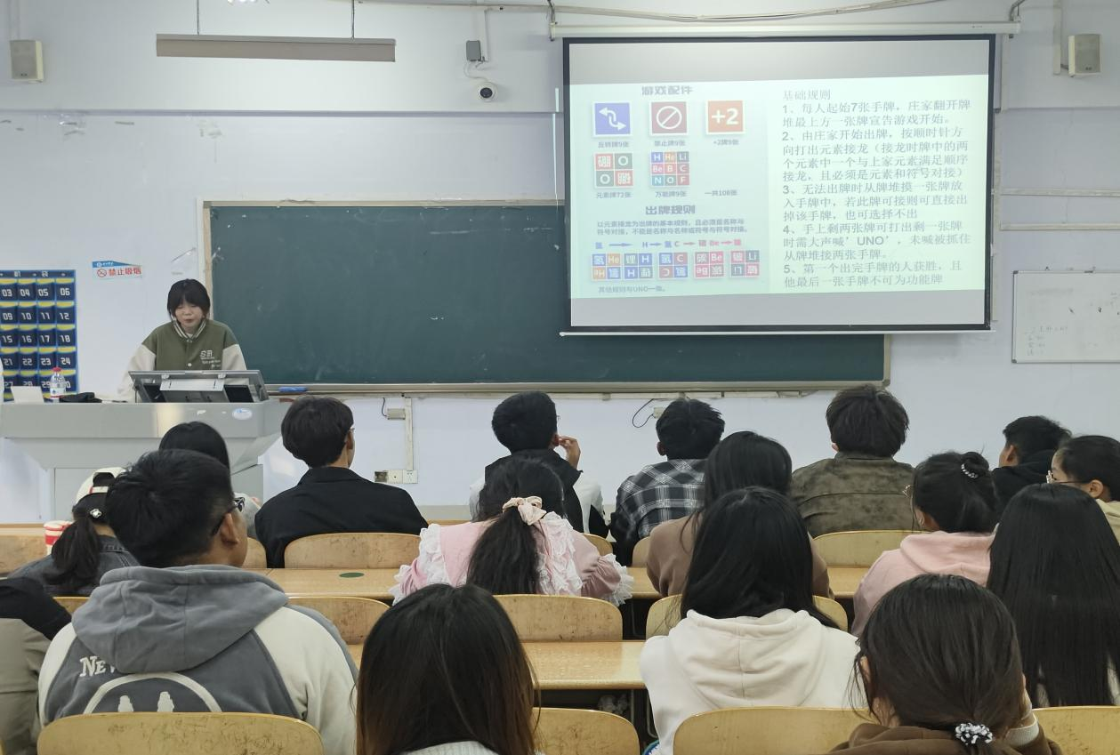 为丰富学生课余生活,激发学生对化学学科的学习热情与探索精神,化学化工学院于10月19日在求实楼开展“元素奇妙旅,化学乐启航”趣味UNO桌游活动。