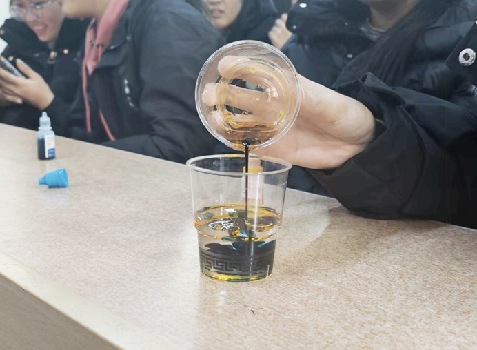 活动中,主持人以“油滴中色素悬浮与扩散”为实验载体,结合生活中油水分层、色素染色的常见现象,系统阐述了物质的极性、溶解性与密度关系等核心知识,引导同学们从生活现象中发现化学逻辑。在动手实验环节,同学们以食用色素、食用油和清水为材料,亲手操作“色素穿油”实验,并观察其动态过程,直观感受极性分子与非极性分子在溶解行为上的显著差异。