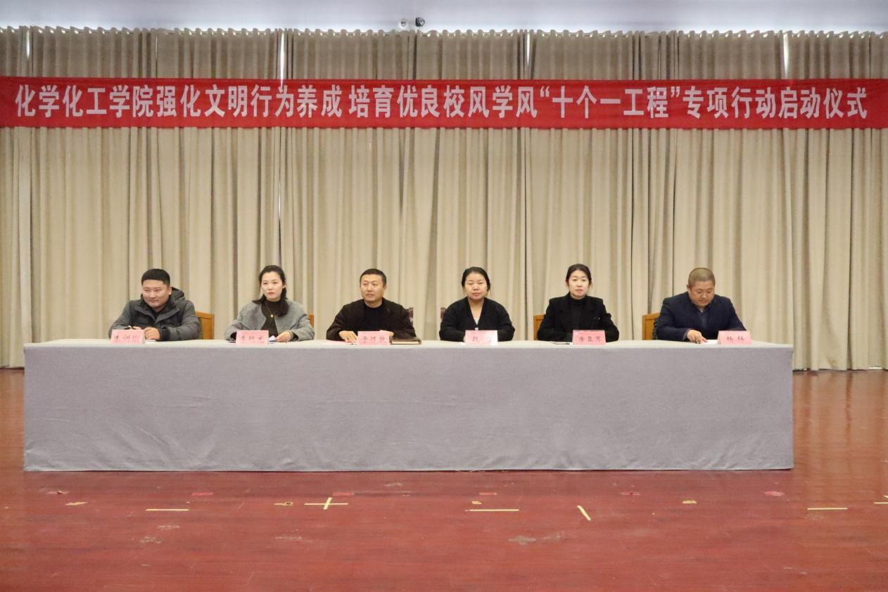 为进一步落实立德树人的根本任务,营造文明和谐的育人环境,推动文明行为养成、优良学风建设工作深入开展,12月3日,化学化工学院于求实楼409举办强化文明行为养成 培育优良校风学风“十个一工程”专项行动启动仪式。学院党委副书记、全体辅导员和学生代表参加此次启动仪式。