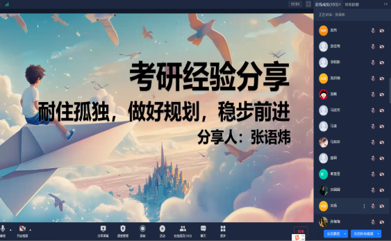 6月28日,化学化工学院举行“研路起航”化学院2026届暑期考研备考线上经验交流会。参加会议的有化学化工学院院长、学院考研工作助理、2026届备考研究生考试全体同学及受邀进行经验分享的2025届已录取研究生的4位同学。
