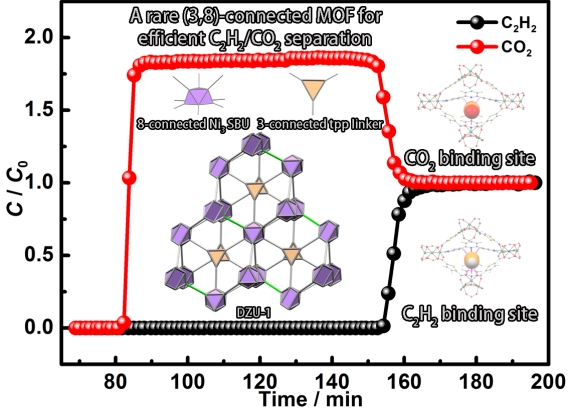 乙炔(C2H2)作为最简单的不饱和烃,被广泛用作燃料和生产各种化学品的原料。在乙炔的生产过程中往往伴有二氧化碳等杂质气体,因此,必须将二氧化碳杂质气体去除才能满足下游产业的需要。但是,乙炔和二氧化碳具有接近的沸点(C2H2:189.3K;CO2:194.7K)和相同的分子动力学尺寸(3.3Å),这使得乙炔和二氧化碳的分离具有极大的挑战性。金属有机框架(MOFs)材料是一种新型的晶态多孔材料,因其具有孔结构可调控及孔环境可修饰等优点而倍受关注,近年来,MOF材料在乙炔和二氧化碳分离方面取得了一些进展,然而,对于高效分离C2H2/CO2来说,合适的吸附量与分离选择性仍然是MOF材料急需解决的问题之一。鉴于此,朱宝勇教授团队在前期工作的基础上(J. Am. Chem. Soc. 2021, 143, 1485-1492),与西北工业大学陈凯杰教授等合作,采用配体构型调控策略,用弯曲构型的配体替代(3, 9)连接pacs拓扑结构中的直线配体,得到了一例(3, 8)连接的具有新型拓扑结构的镍基MOF(DZU-1),DZU-1具有独特的口袋型孔结构,在室温和1个大气压条件下,C2H2吸附量达到90.6mL/g,C2H2/CO2分离比达到6.1。