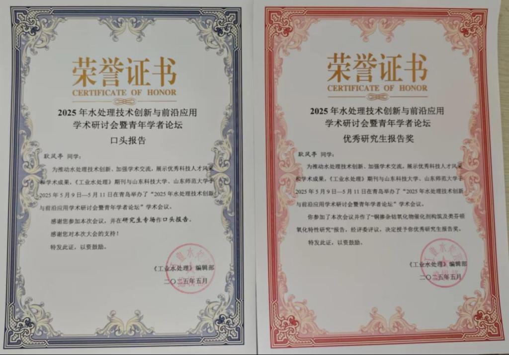 会议邀请了包括院士、长江学者、杰青在内的50余位专家学者做主题和邀请报告,为水处理领域科研工作者与技术工程师们提供交流新技术、拓展新方向、启迪新思维、探索新方法的平台,助力工业水处理技术的创新发展。我校与山东理工大学联合培养研究生耿风亭以“铜掺杂钴氧化物催化剂构筑及类芬顿氧化特性研究”为题作研究生分会场口头报告,并与参会师生进行学术交流。据悉,耿风亭自入学以来已发表SCI论文2篇(其中一区1篇、二区一篇),另有1篇文章在投。此次研究生走出校门参加学术会议并获优秀研究生报告奖,充分体现了学校研究生培养质量不断提高。