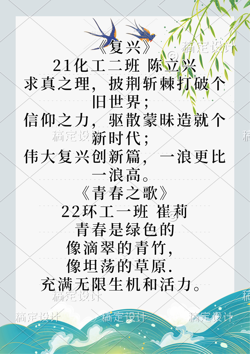 诗歌作为中华民族传统文化中的优秀成分,不仅能够丰富人的精神世界、增强人的精神力量,也是人们表达内心激情的最好工具。为了让同学们更好地通过诗歌来表达自己的情感,丰盛内在,化学化工学院于4月10日-23日举办了“致可爱的我和你”三行诗评选活动。