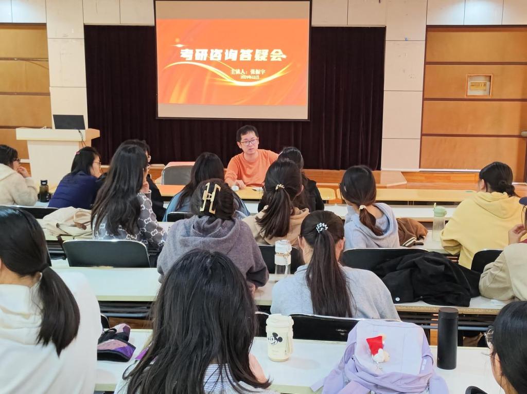 会上,张老师从多年经验出发,从考研形势、今年考研变化、报考策略等方面进行详细介绍,讲解备考策略和考研信息查询渠道,从合理设定考研目标、提高专业复习效率和调整备考心态三个方面对在场毕业生提出合理意见。在互动交流环节,张振宇老师与在场毕业生进行一对一交谈,对毕业生提出的问题进行耐心解答。