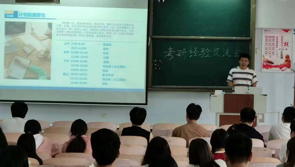 在交流会上,考研取得优异成绩的几位同学从自身的考研经历出发,围绕如何选取专业和院校、如何制定复习计划、如何安排时间、怎样调整心态、学习过程中的建议以及其他注意事项等方面系统详细地向同学们讲解了自己的亲身体验和感受。