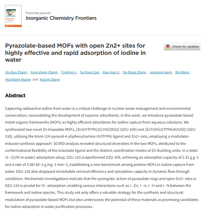 近日,我校与山东理工大学联合培养研究生张新丹(导师:张秀玲教授),作为第一作者,以德州学院为第一完成单位在SCI期刊《Inorganic Chemistry Frontiers》(ESI化学学科期刊,中科院一区)发表题为“Pyrazolate-based MOFs with open Zn2+ sites for highly effective and rapid adsorption of iodine in water”的学术成果。山东省硅单晶半导体材料与技术重点实验室(筹)、化学化工学院配合物功能材料团队张秀玲教授和张永正副教授为通讯作者。该研究得到了天津工业大学黄宏亮研究员和苏州大学放射医学与辐射防护国家重点实验室王彬教授的指导,二人亦作为共同通讯作者参与了此项工作。