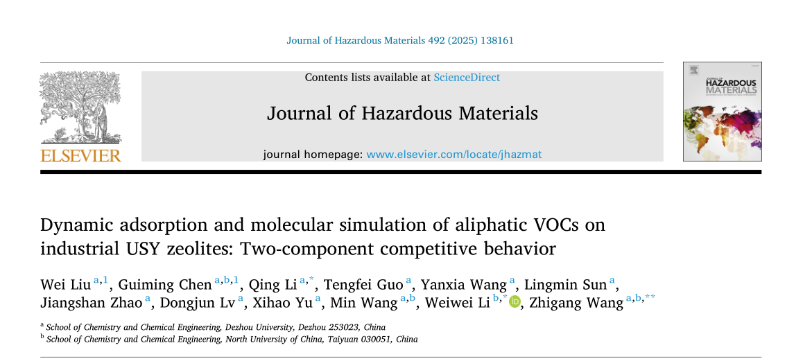 近日,我校化学化工学院刘伟博士、王志刚教授团队,在国际知名期刊《Journal of Hazardous Materials》(中科院一区TOP,IF=12.2)上发表学术论文“Dynamic adsorption and molecular simulation of aliphatic VOCs on industrial USY zeolites: Two-component competitive behavior”,论文第一作者为刘伟博士,研究生陈贵明为共同第一作者,德州学院为第一依托单位,化学化工学院王志刚教授、李清博士为通讯作者。