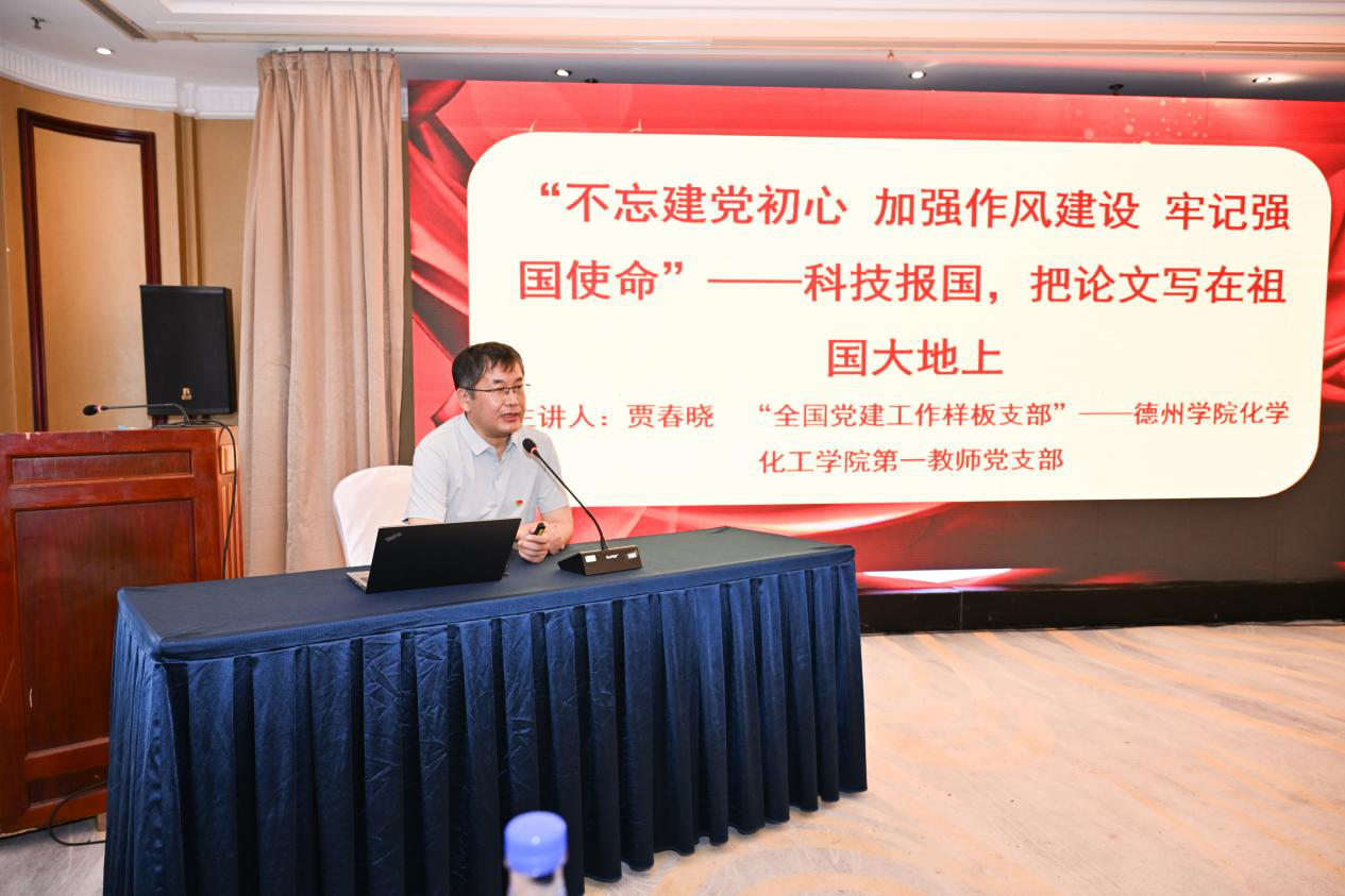 作为全国党建工作样板支部,化学化工学院第一教师党支部在活动中发挥引领作用。支部书记贾春晓以《不忘建党初心,加强作风建设、牢记强国使命——科技报国,把论文写在祖国大地上》为题讲授党课。党课结合“七一”回顾党的历史,解读中央八项规定精神与新时代作风建设内涵,分享支部创建全国样板支部经验,号召党员以科技创新推动高质量发展。