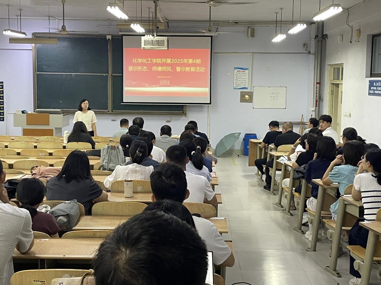 为持续深化意识形态工作责任制落实成效,巩固拓展新时代教师队伍建设成果,进一步夯实“清廉学院”建设根基,9月16日,化学化工学院在求实楼118举办2025年第4期意识形态、师德师风、警示教育活动。本次活动由学院党委副书记、院长主持,全体教职工全员参与,以“强师德、守底线、育新人”为核心主题,推动学院师德师风建设与意识形态工作向更深层次、更高质量迈进。