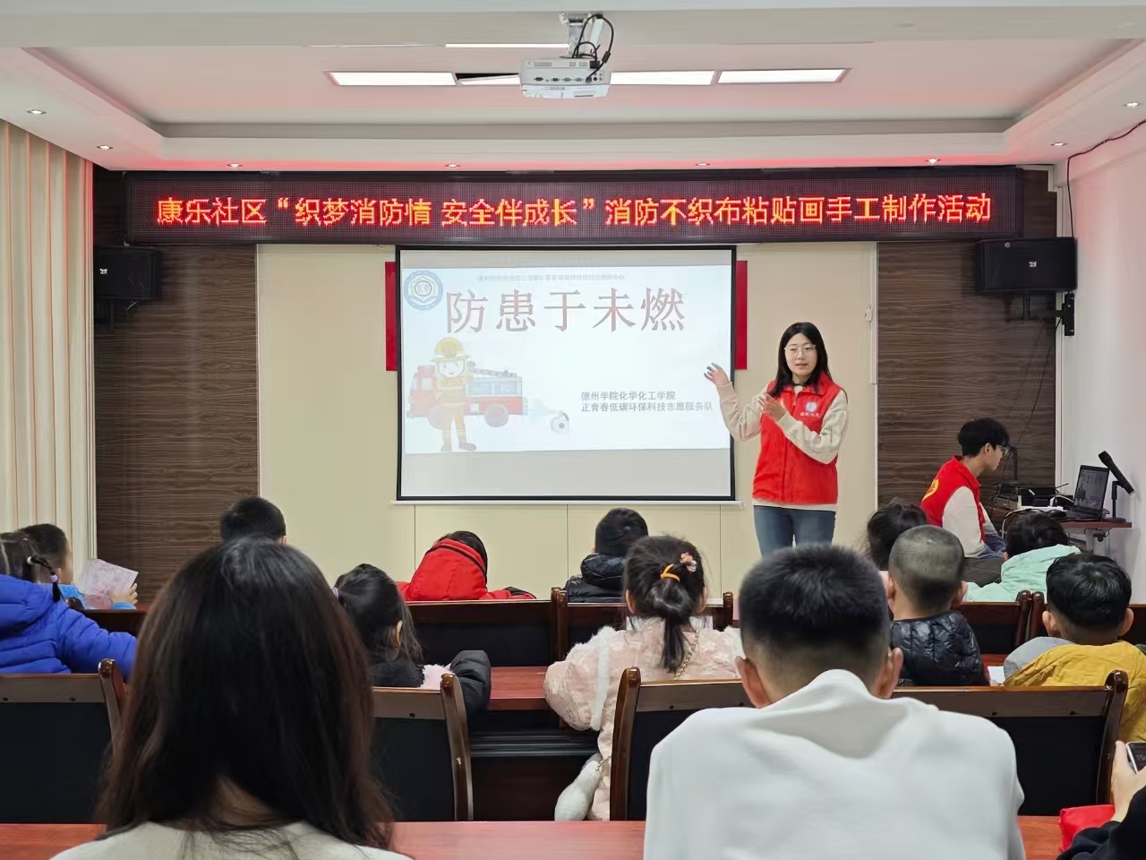 为提高社区小朋友的消防安全意识,强化防火和疏散逃生技能,提高其自防自救能力。化学化工学院于11月26日在康乐社区开展“织梦消防情,安全伴成长”消防不织布粘贴画手工制作活动。