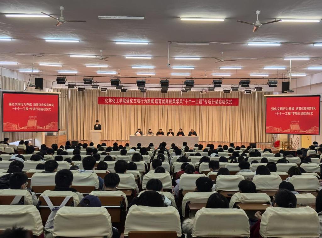 学生工作办公室主任宣读《化学化工学院强化文明行为养成 培育优良校风学风“十个一工程”专项行动实施方案》,她详细介绍了本次方案的主题、目标、内容以及具体安排。学院将开展一系列丰富多彩的活动,激发学生学习兴趣,增强学生文明修养。