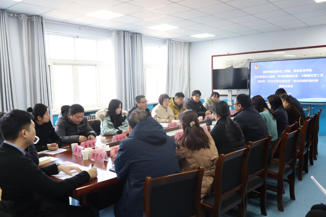 为深入推动校地资源共享、优势互补,助力大学生实践成长与地方经济社会发展,2025年2月23日,化学化工学院与共青团庆云县委开展2025年“百万大学生进社区”社会实践校地对接座谈会。庆云县团委主要负责同志、化学化工学院党政领导班子成员、有关负责同志参加会议。