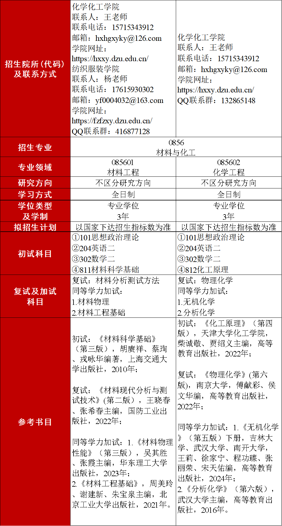 德州学院材料与化工硕士学位点由化学化工学院和纺织服装学院共同建设,设有化学工程、材料工程两个专业领域,拥有山东省硅单晶半导体材料与技术重点实验室(筹)和有机功能材料绿色低碳技术山东省工程研究中心等5个省级研发平台、4个校企研究生联合培养基地。专任教师中有国务院特殊津贴专家、泰山产业领军人才称号等省部级人才6名,省级教学科研团队7个。